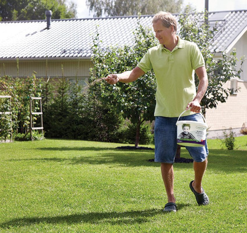 – Gräsmattan väljs alltid i första hand efter användningsändamålet. Vissa fröblandningar växer snabbare och blir snabbt gröna, men de kanske inte är lika tåliga som gräsfrön som växer långsammare. Om trädgården är skuggig lönar det sig att välja en fröblandning för skuggiga gårdar, berättar Jussi Petäjä, produktgruppschef för trädgårdsprodukter på GreenCare.